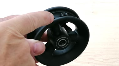 Track adjustment: Make sure that they pull slightly outwards rather than inwards. When checking, slide next to a tile joint. If this is not correct, or if it deviates noticeably when floating, then make a toe correction on the front and/or rear wheel. To do this, remove the plastic cap on the wheel nut, loosen the wheel axle, push the wheel in the desired direction and tighten the axle bolt again. The wheel nuts are self-locking, but can still be loosened. Ideally, the Floig should be standing with the wheels on the ground. It is clear that if the front wheel is steered to the right, the Floig will steer to the right and to the left. The rear wheel is different - if you steer the rear wheel to the right, the Floig steers to the left and vice versa. These steering movements take place in the axis range in the hundredths of a mm range and are not visible to the eye. If this does not lead to the desired result, repeat the procedure and also loosen the Allen screw of the lever of the backstop, if backstops are available. When tightening the screws, press the Floig slightly against the rolling direction while standing on the floor if backstops are fitted. Tighten all screws carefully but firmly!