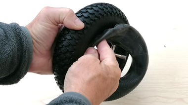 Tube assembly: First insert the tube into the tire, then coat the tire with assembly soap or soft soap. Next, insert the valve into the rim opening so that the valve points against the direction of travel. Then, starting from the valve, press one half of the tire after the other onto the rim. To make this easy, always press the area that is already on the rim completely into the rim - the rest will then go almost by itself.